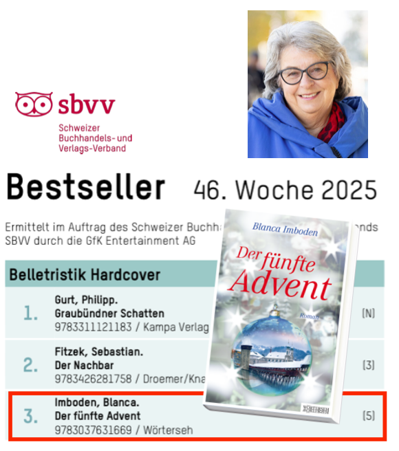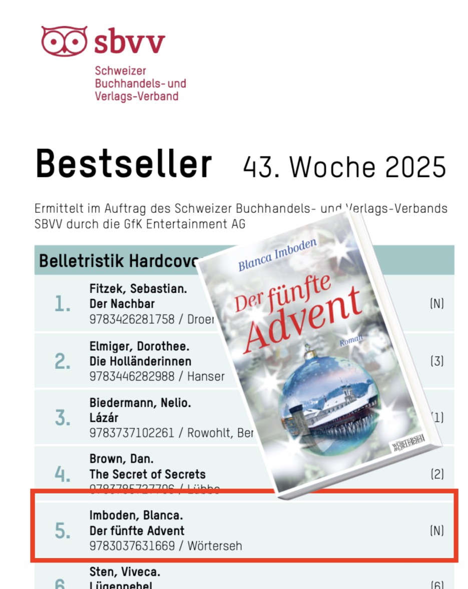 Mein Weihnachtsroman erscheint nicht erst am fünften Advent, sondern ist schon am 20. Oktober erschienen. Er ist am 28. Oktober auf Platz 5 in die Schweizer Bestsellerliste eingezogen. Man kann mein neues Buch natürlich in jeder guten Buchhandlung kaufen, auch beim Wörterseh Verlag.