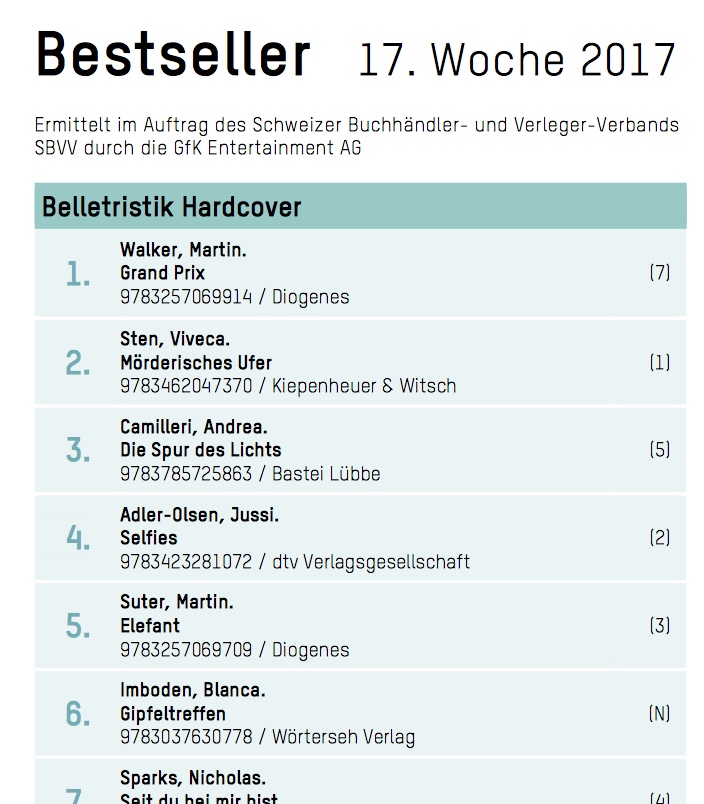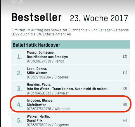 In der Schweizer Bestsellerliste erreichte das Buch bisher folgende Platzierungen: 6 - 2 - 2 - 2 - 6 - 5
