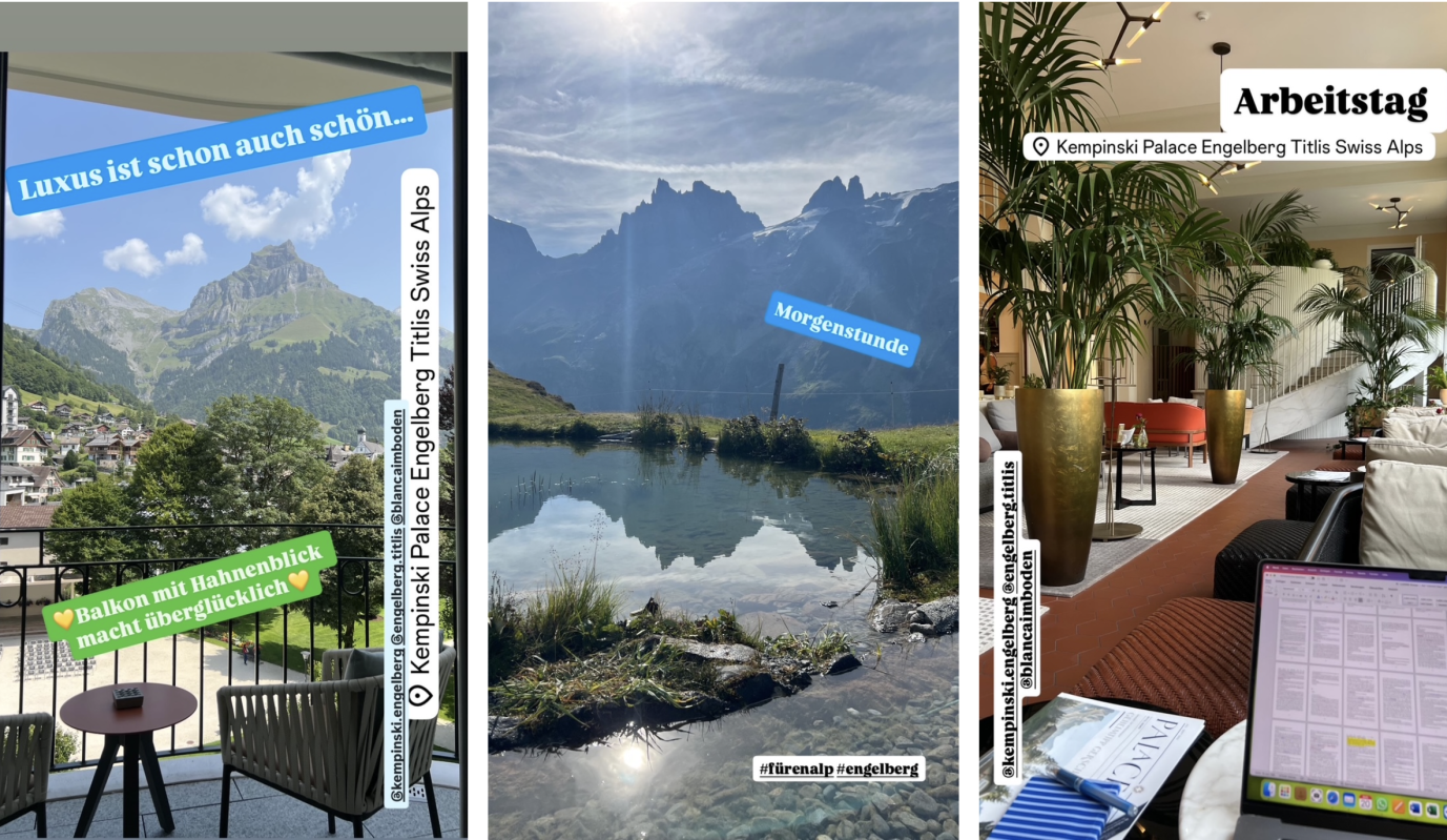 Jetzt wohne ich schon seit einigen Tagen im Kempinski Palace in Engelberg. Ja, Luxus ist schon auch schön. Jeden Morgen sage ich laut zu meinem Spiegelbild: »Blanca, gewöhn Dich bloss nicht daran!« Dieses Hotel könnte ich mir ja nie leisten, geniesse es dafür um so mehr, Tag für Tag. Der Balkon mit direktem Hahnenblick, der Infinity-Pool mit Bergpanorama... DANKE, Kempinski Palace Engelberg!