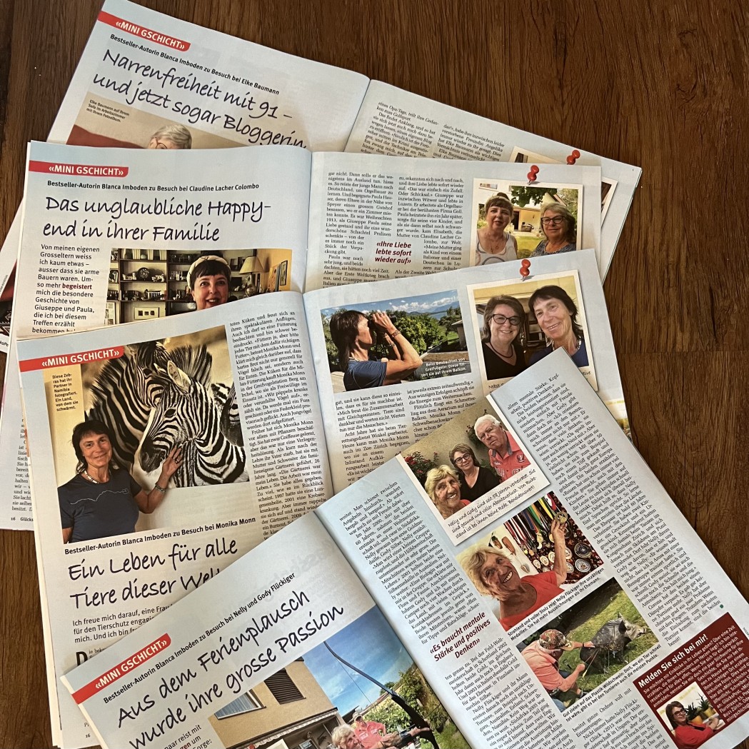 Seit September 2022 arbeite ich für die «Glückspost». Alle 14 Tage erscheint dort eine Doppelseite mit dem Namen «MINI GESCHICHT». Meine eigene Serie! Ich besuche MENSCHEN, die mir ihre Geschichten anvertrauen. Diese Arbeit ist eigentlich keine Arbeit, sondern eine Freude. Vielleicht machen Sie auch mal mit, und erzählen mir Ihre Geschichte? Sie muss nicht umwerfend und tragisch sein, spektakulär und wild. Vielleicht eine besondere Reise, die spezielle Erinnerung, ein aussergewöhnliches Hobby? Ganze Lebensgeschichten kann ich allerdings nicht zu Papier bringen, dazu ist unser Platz zu begrenzt. Aber ich komme zu Besuch und höre zu.