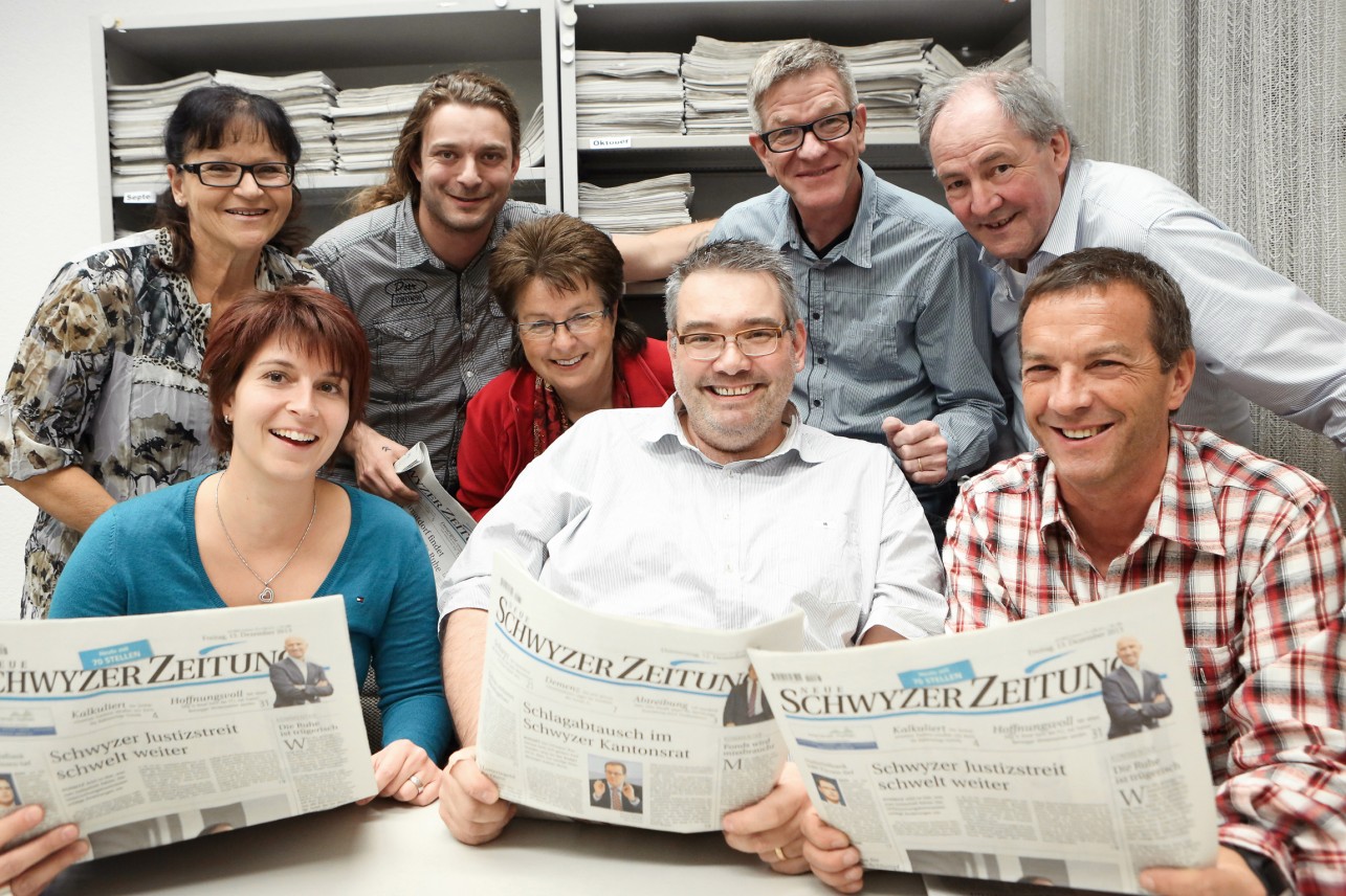 Ich habe 15 Jahre bei der Neuen Schwyzer Zeitung gearbeitet, wo ich das Redaktionssekretariat führte und als redaktionelle Mitarbeiterin für die Zeitung schrieb. Das war der perfekte Job für mich. Ende 2013 wurde diese Redaktion leider aufgelöst. Traurig. Schaut mal, was für ein cooles Team wir waren: