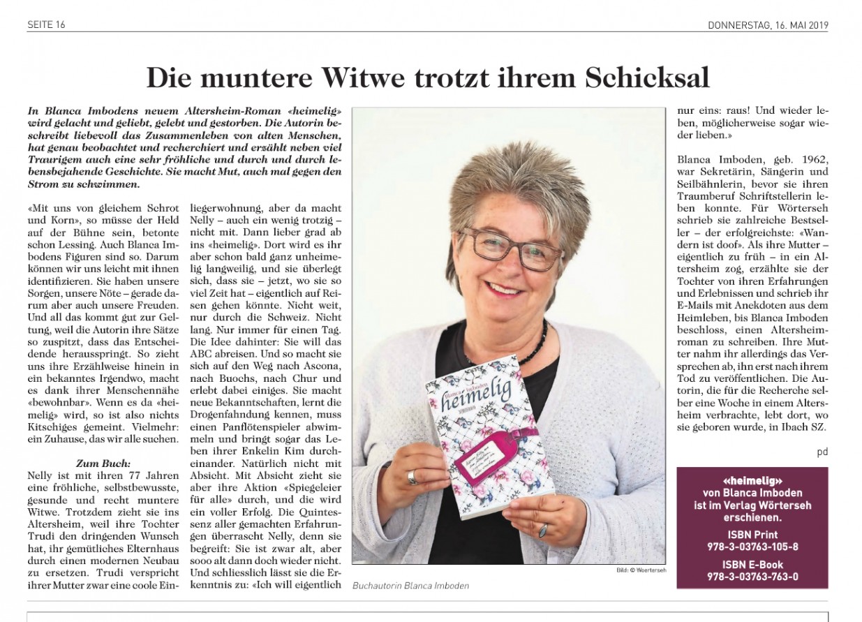 «In Blanca Imbodens Altersheim-Roman wird gelacht und geliebt, gelebt und gestorben. Die Autorin beschreibt liebevoll das Zusammenleben von alten Menschen, hat genau beobachtet und recherchiert und erzählt neben viel Traurigem auch eine sehr fröhliche und durch und durch lebensbejahende Geschichte, die Mut macht, auch mal gegen den Strom zu schwimmen.»